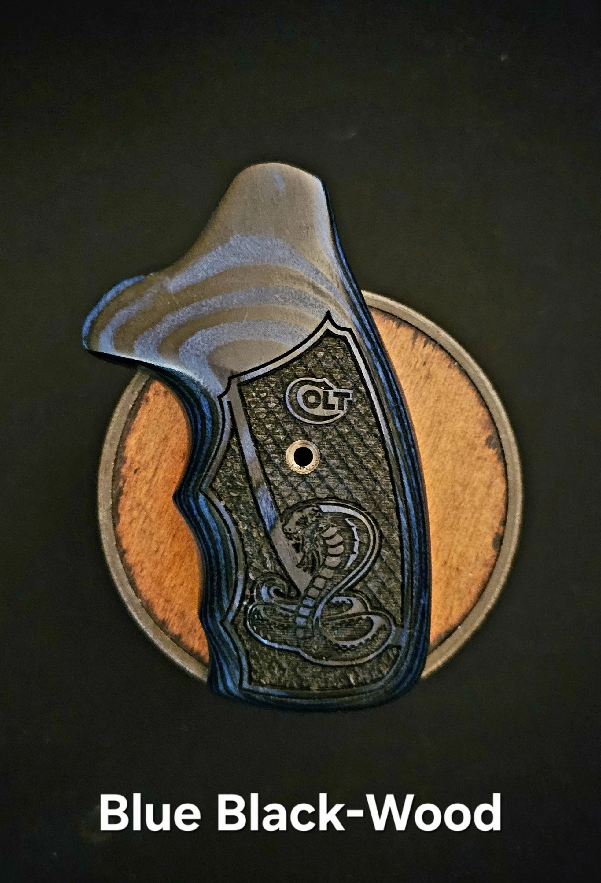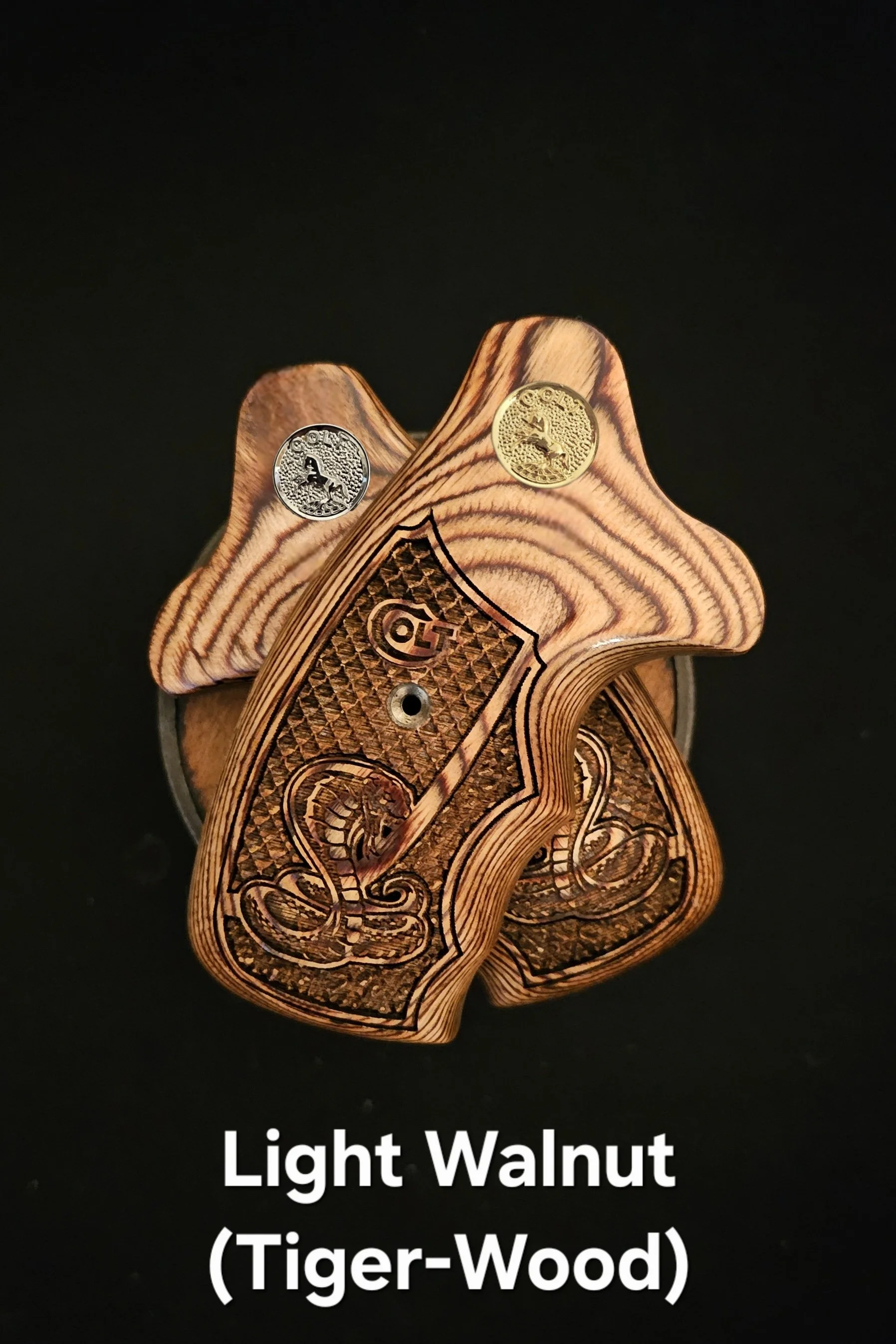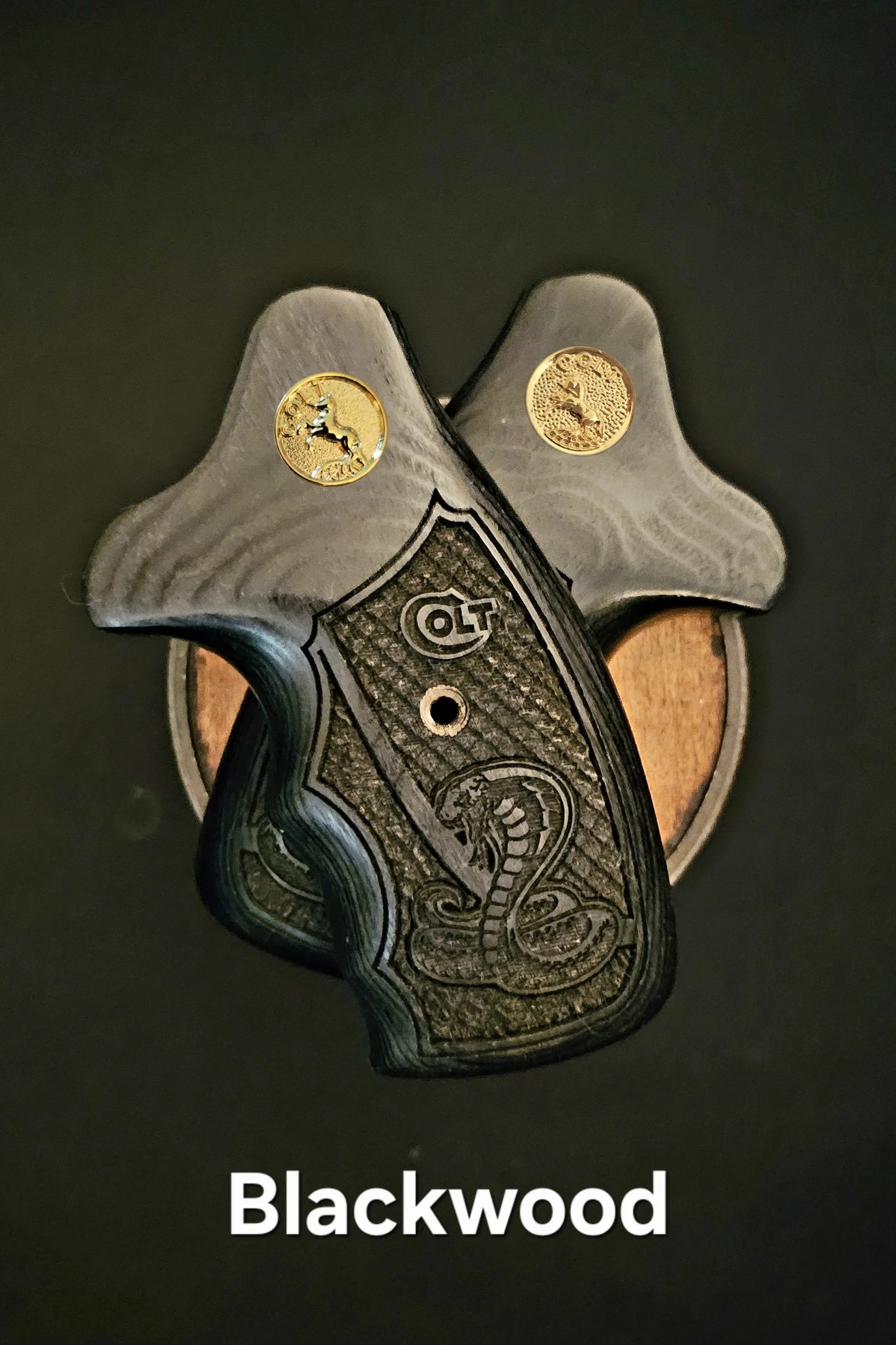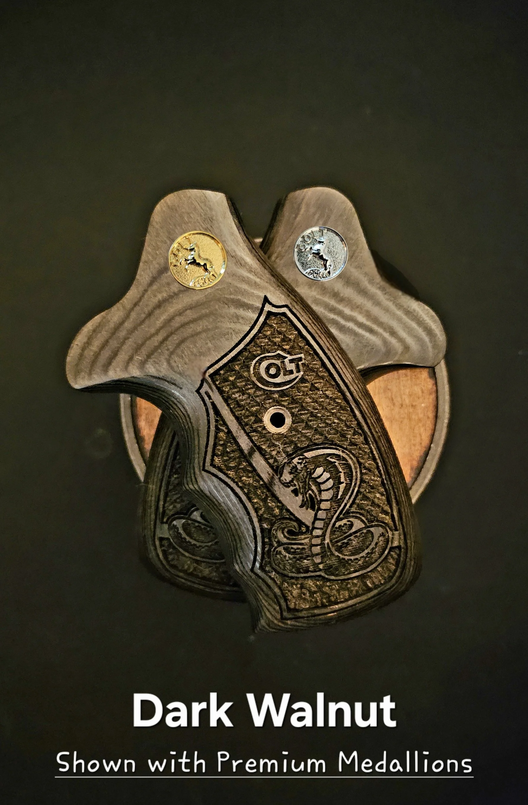 Colt King Cobra 2019-present / Viper 2024+ / Cobra 2017-present Extended FGT “Fingergroove” Target Grips with our Exclusive Inset "King Cobra" with Mini Dragonscales and Black Diamond™ Stipple Engraving. Available in Blackwood, Red-Wood, Walnut, Dark Walnut, Tiger-Wood, & Blue Black-wood, with Optional Top Laser Logo, or 1/2” Silver or Gold Medallions in Authentic or Premium. Note: 15mm Medallions are too large for this top section. *Note: Netticks Grips are manufactured using Engineered Wood, Color names are meant as identifiers and do not indicate a wood type.