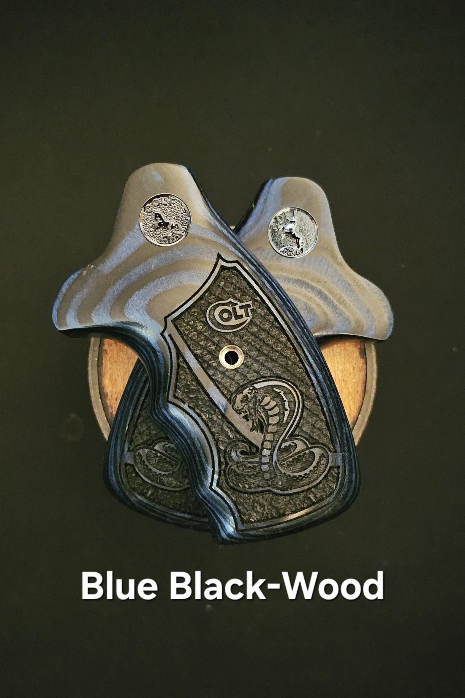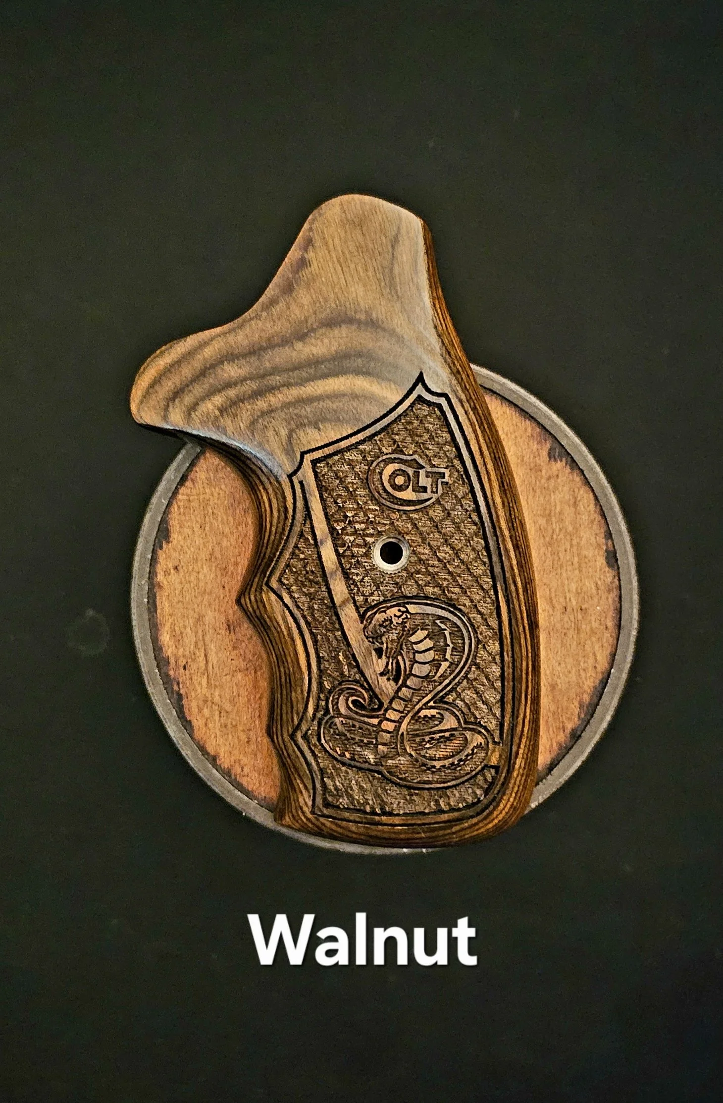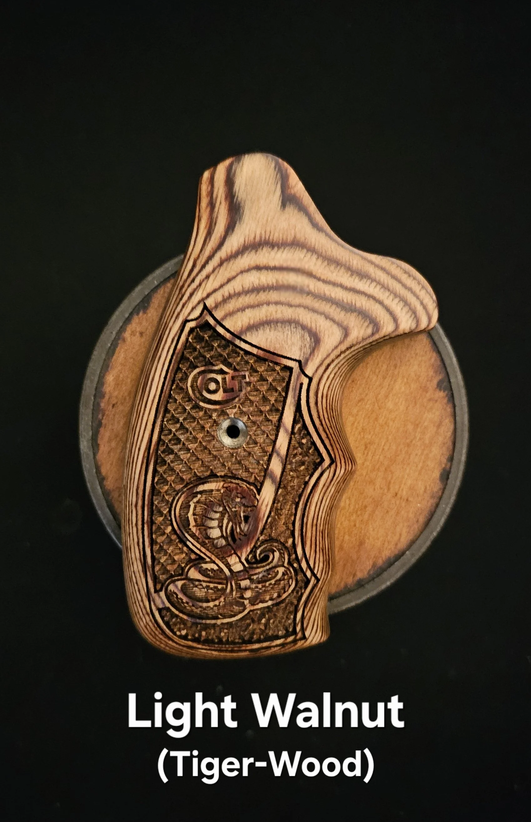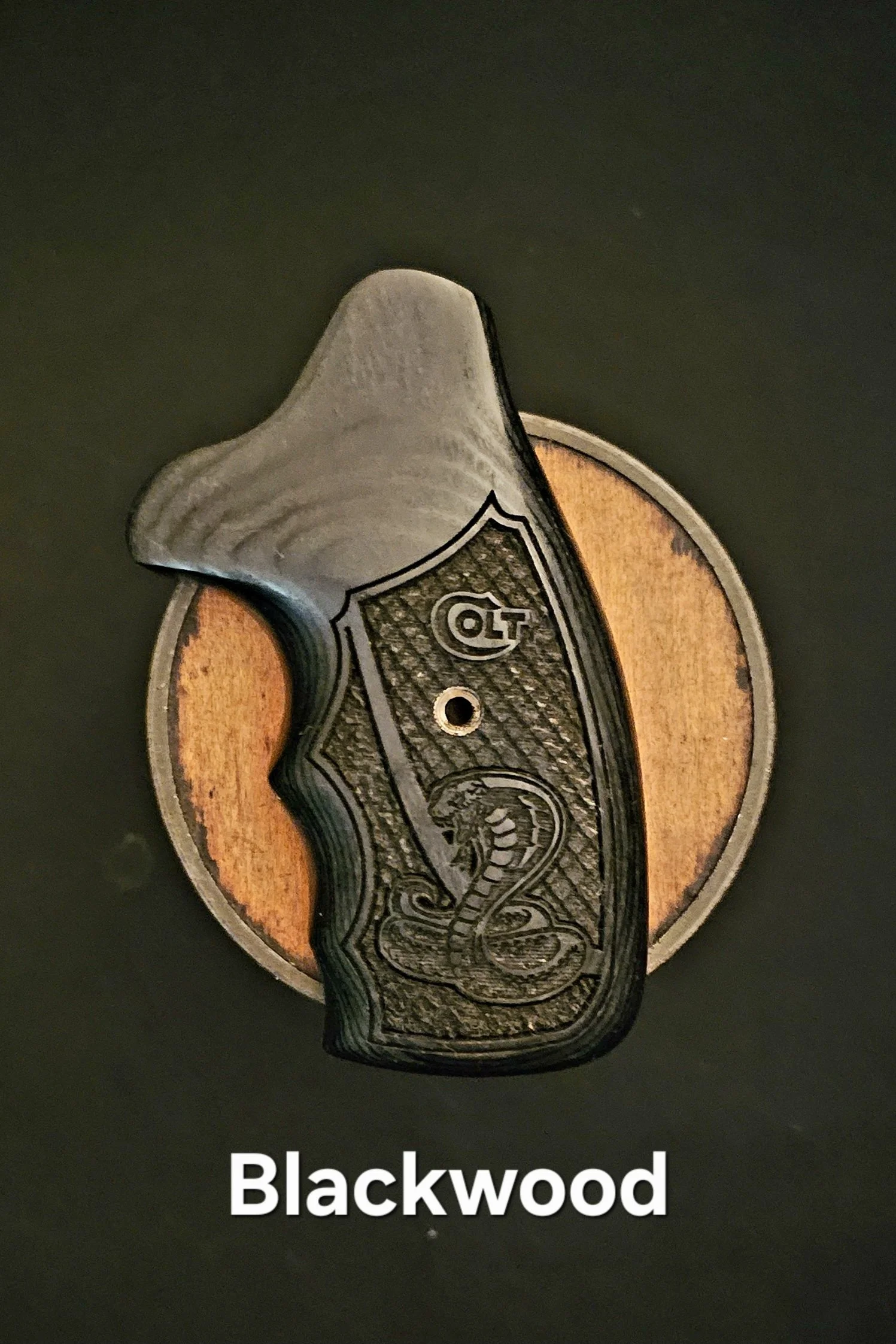 Colt King Cobra 2019-present / Viper 2024+ / Cobra 2017-present Extended FGT “Fingergroove” Target Grips with our Exclusive Inset "King Cobra" with Mini Dragonscales and Black Diamond™ Stipple Engraving. Available in Blackwood, Red-Wood, Walnut, Dark Walnut, Tiger-Wood, & Blue Black-wood, with Optional Top Laser Logo, or 1/2” Silver or Gold Medallions in Authentic or Premium. Note: 15mm Medallions are too large for this top section. *Note: Netticks Grips are manufactured using Engineered Wood, Color names are meant as identifiers and do not indicate a wood type.