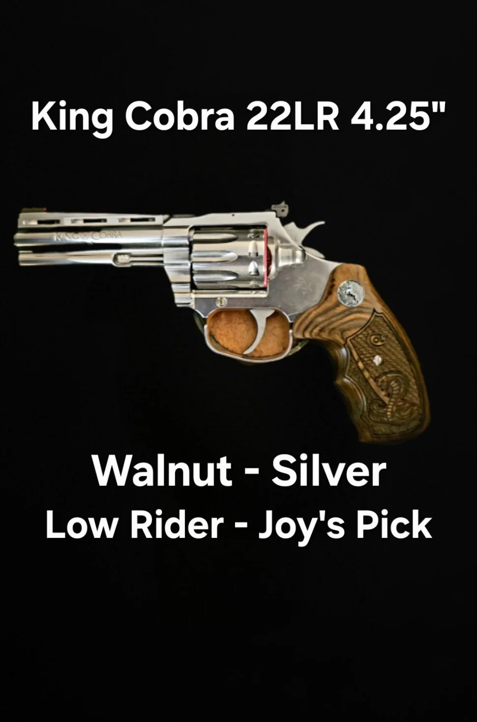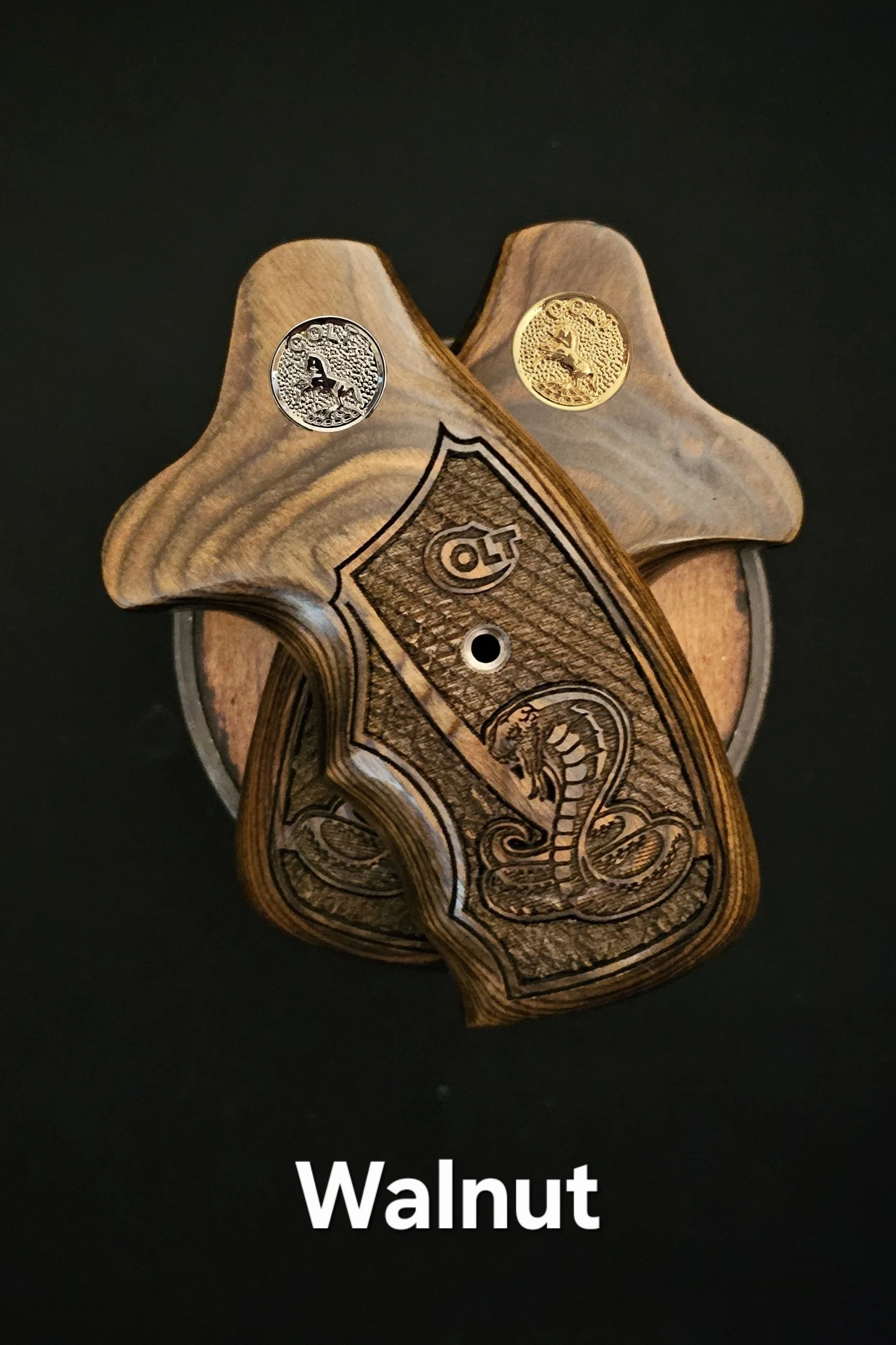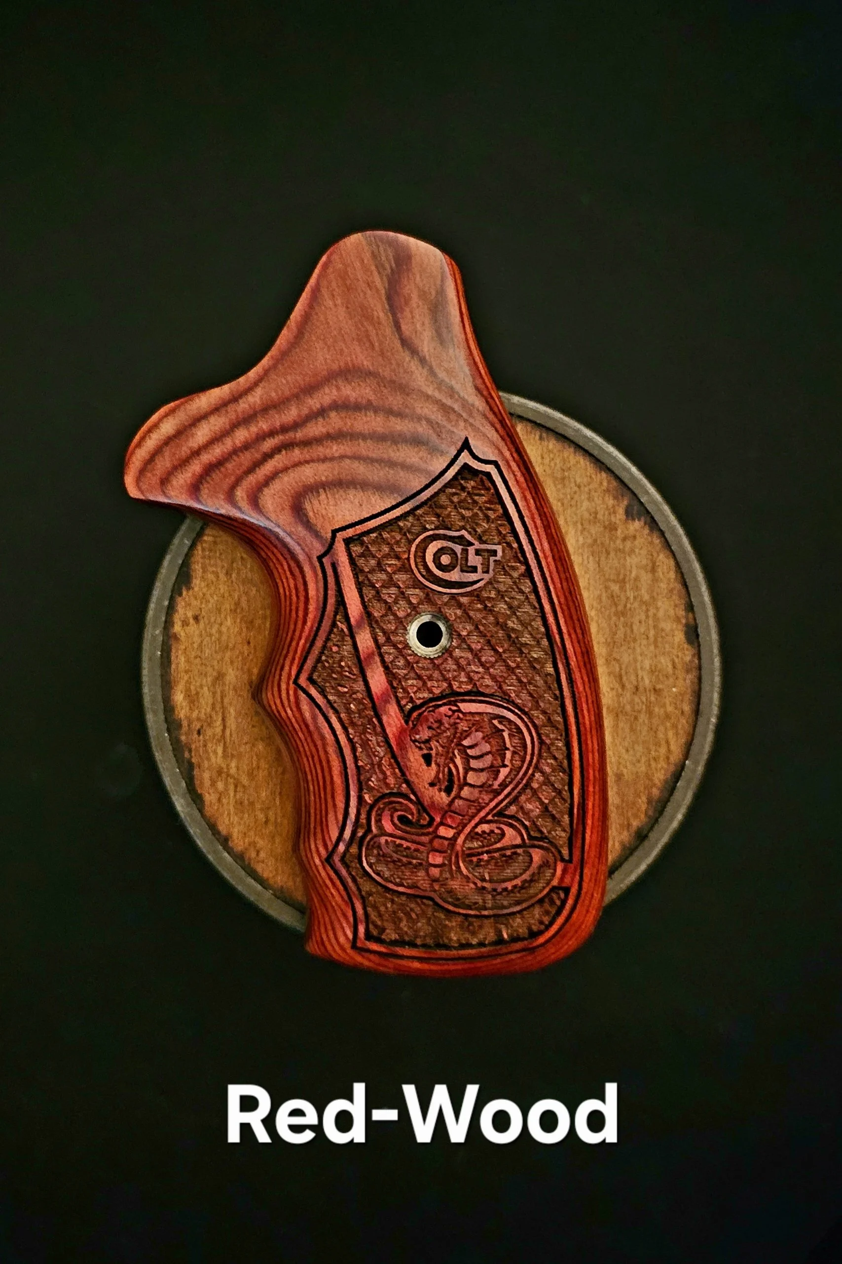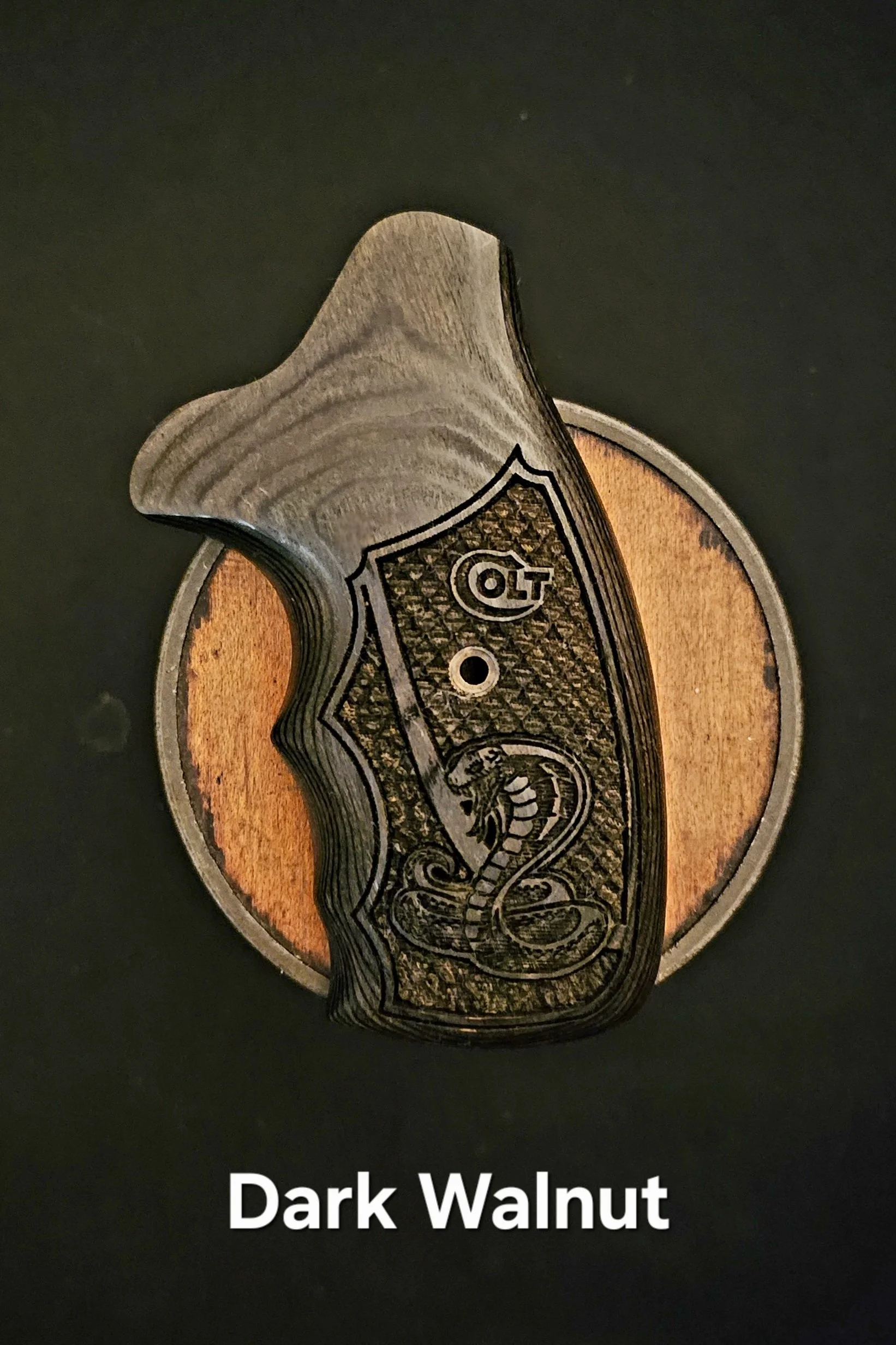 Colt King Cobra 2019-present / Viper 2024+ / Cobra 2017-present Extended FGT “Fingergroove” Target Grips with our Exclusive Inset "King Cobra" with Mini Dragonscales and Black Diamond™ Stipple Engraving. Available in Blackwood, Red-Wood, Walnut, Dark Walnut, Tiger-Wood, & Blue Black-wood, with Optional Top Laser Logo, or 1/2” Silver or Gold Medallions in Authentic or Premium. Note: 15mm Medallions are too large for this top section. *Note: Netticks Grips are manufactured using Engineered Wood, Color names are meant as identifiers and do not indicate a wood type.