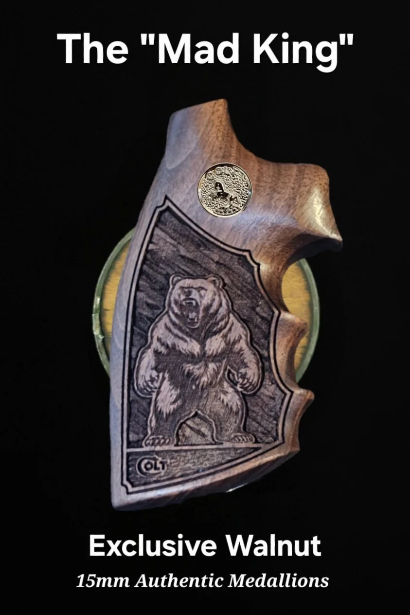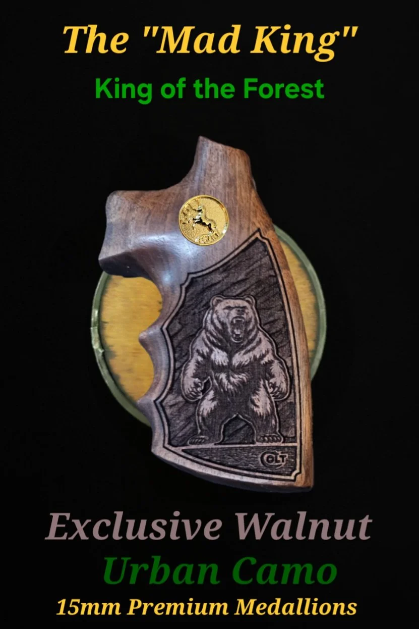 HRV Grips® Colt Grizzly/Kodiak The "Mad King" - King of the Forest series Fingergroove Grips with our Exclusive Urban Camo™ surrounding our New Angry Standing Grizzly-Kodiak on a Stipple ground with Serpentine, choose optional Top Section of Laser Logo engraving, 1/2” or 15mm Colt Authentic Silver or Gold Medallions, or 1/2” or 15mm .999 Silver or 24k Gold Plate Custom Medallions. Choose from Zebrawood, Pau Ferro, Camouflage, Cocobolo, Rosewood, Kingwood or our Exclusive SilverBlack or Fancy Walnut.
