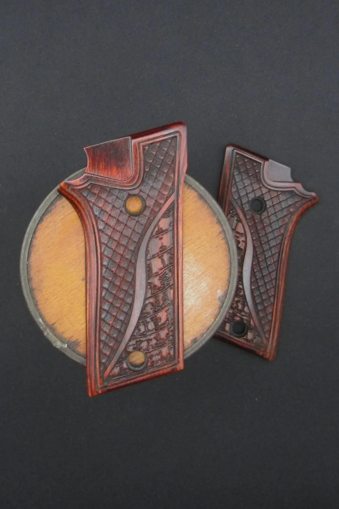 Taurus PT911/PT940 Panel grips in Rosewood with our Dragonscales and Gatorback in a Two Part Design. The Taurus PT940 takes the key features of the Taurus 92 and packages them in a compact firearm that is 20% smaller and 20% lighter. If you have something else in mind go to our Home Page and create your own unique grips!