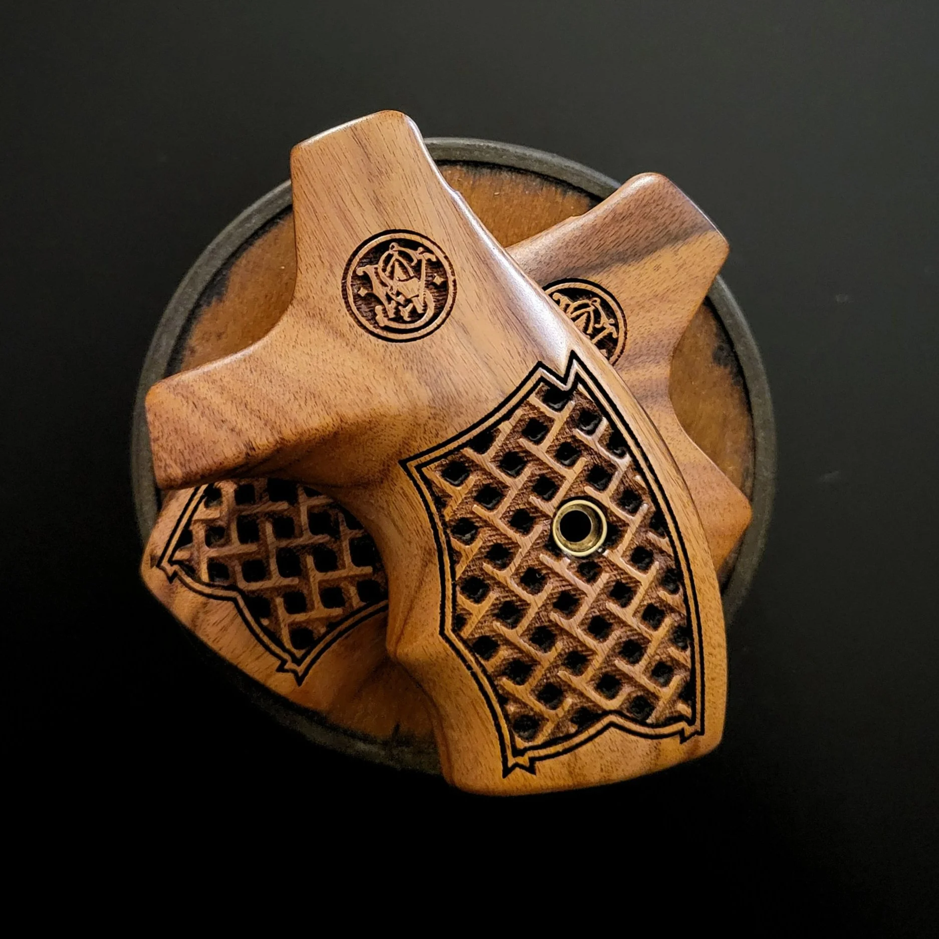 Basketweave is one of our most popular patterns. With a Deep 3d three layer design. This pattern is more about beauty than adding gripping surface which is why we recommend a Two Part design with a more aggressive front panel such as Stipple or Checkering.