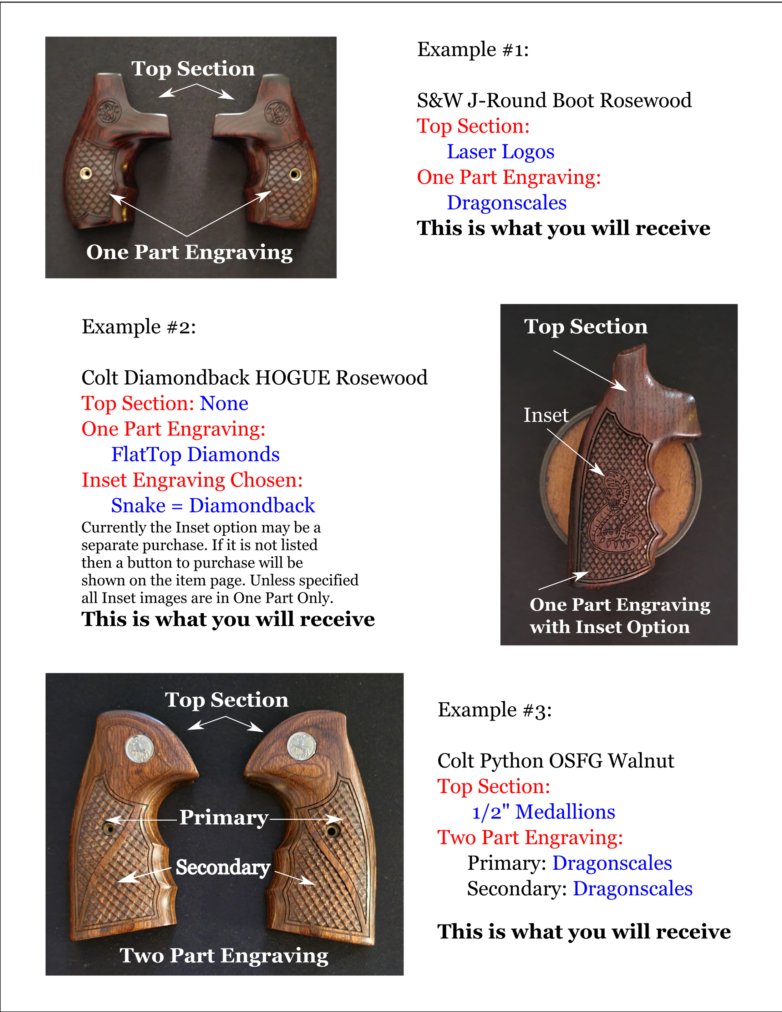 LAST NOTE: What is Top Engraving, and I wrote in my initials on my form… First, TOP SECTION is a space, a very small space, at the top of grips. 99.9% of Top Engraving is the Laser Logo of the manufacturer. Last, if you purchased Medallions that means you COULD NOT purchase Top Engraving, because you can have one OR the other, NOT BOTH! This is the reason they are in the same choice section, because you cannot have both options. Writing anything in to spaces you did not purchase, clicking on a medallion color when you did not purchase medallions, or choosing a second pattern when you only purchased one are all things that 100% will delay your order. We will no longer contact you, these things will be ignored entirely, however the system prints based on checks and balances, so writing in the Top Engraving section that you did not purchase means your order does not print. When we check the orders list we can see your order is not yet printed. So please leave items you did not purchase blank so your order is put into our rotation when it should be and not 3 days later. If you’re unsure please contact us for help!